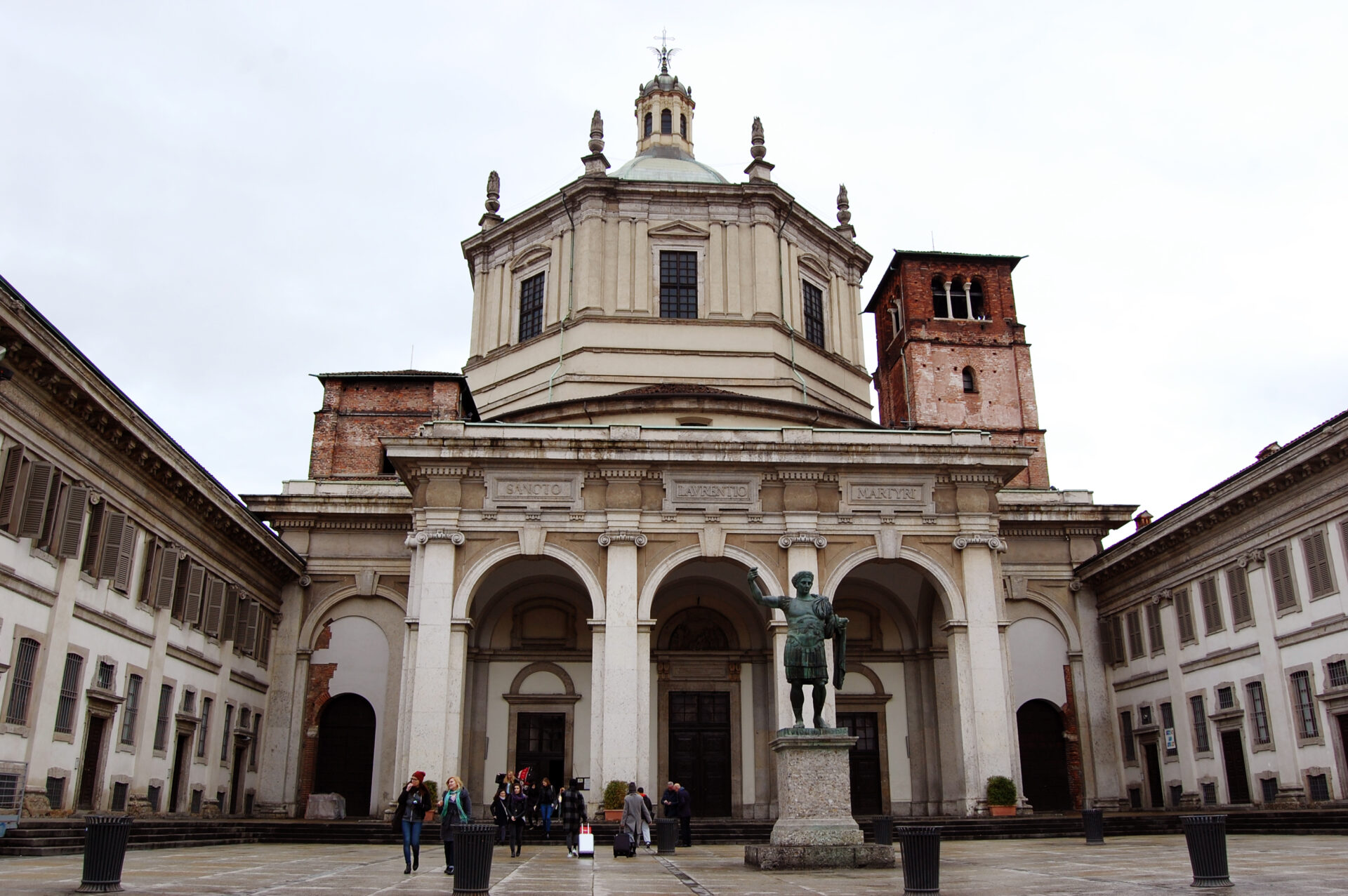 Na unikatowość tego kościoła składa się kilka elementów: pochodzi z IV w., pierwotnie został wybudowany przez Rzymian (przed fasadą znajduje się rząd koryńskich kolumn, ograniczających wcześniejszą świątynię), posiada największą w Mediolanie kopułę oraz centralny plan, przypominający bizantyjskie kościoły, w tym Hagię Sophię w szczególności. Wchodząc do świątyni zobaczycie konstrukcję opartą na 4 eksedrach (czyli zamkniętych półkoliście aneksach) z centralnie umieszczoną kopułą – jest to typowe bizantyjskie założenie, dodatkowo “egzotycznego” charakteru nadaje kościołowi przylegająca kaplica św. Akwilina z zachowanymi do dziś bizantyjskimi mozaikami pochodzącymi z V w. Prawdziwe cudo!