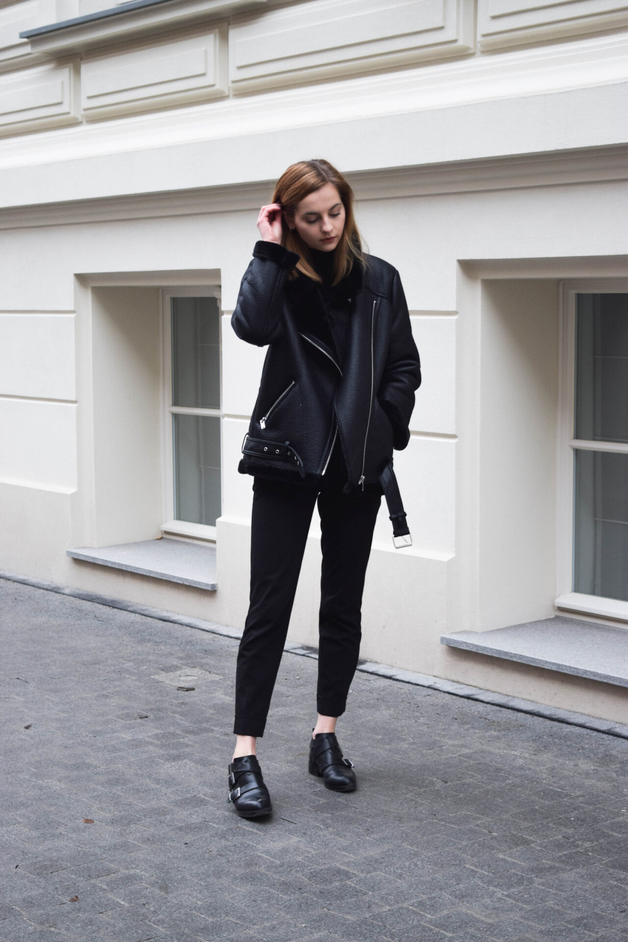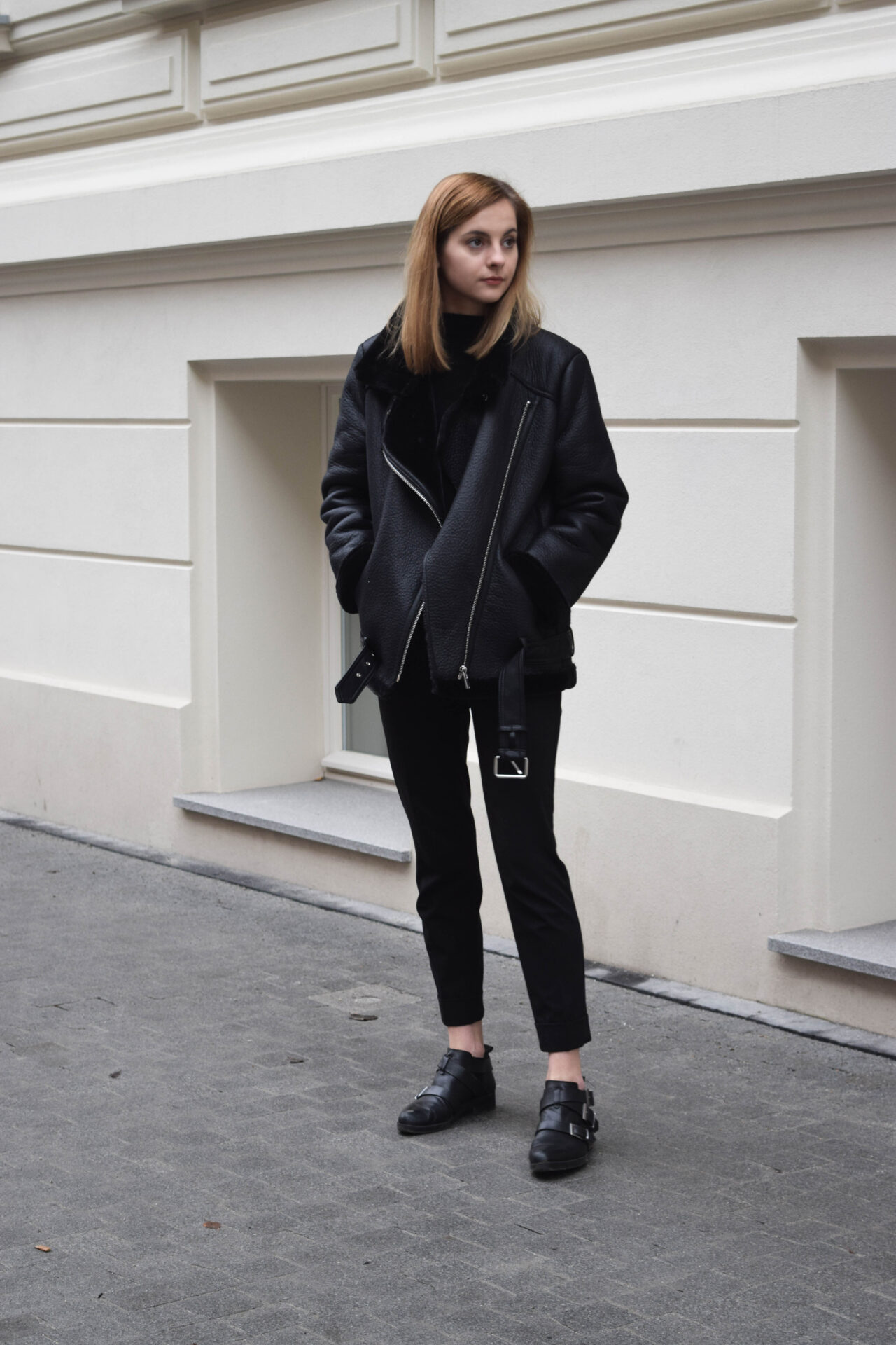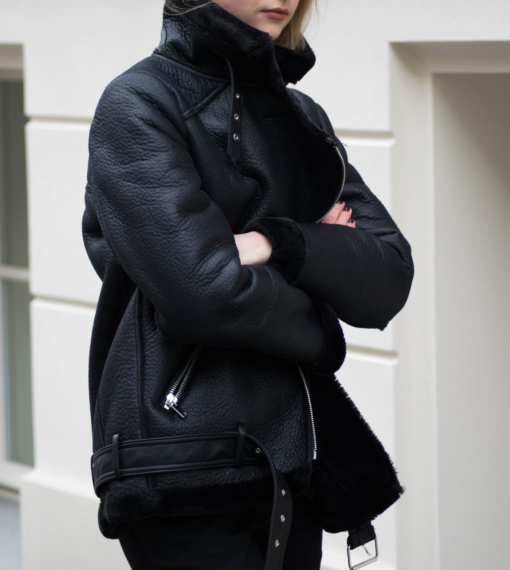 Już w zeszłym roku zakochałam się w czarnym kożuchu od Acne Studios i od tamtego czasu szukałam podobnego. W tym roku niemal identyczne modele wprowadziła Zara, co więcej zadbała również o jakość kurtek i detale, wyposażając ten model w porządny pasek i kołnierz ze stójką. Aby dodatkowo podkreślić oversizowy charakter kożucha ( tak jak w przypadku Acne Studios) kupiłam rozmiar L, co też wam polecam, jeżeli planujecie zakup podobnego.