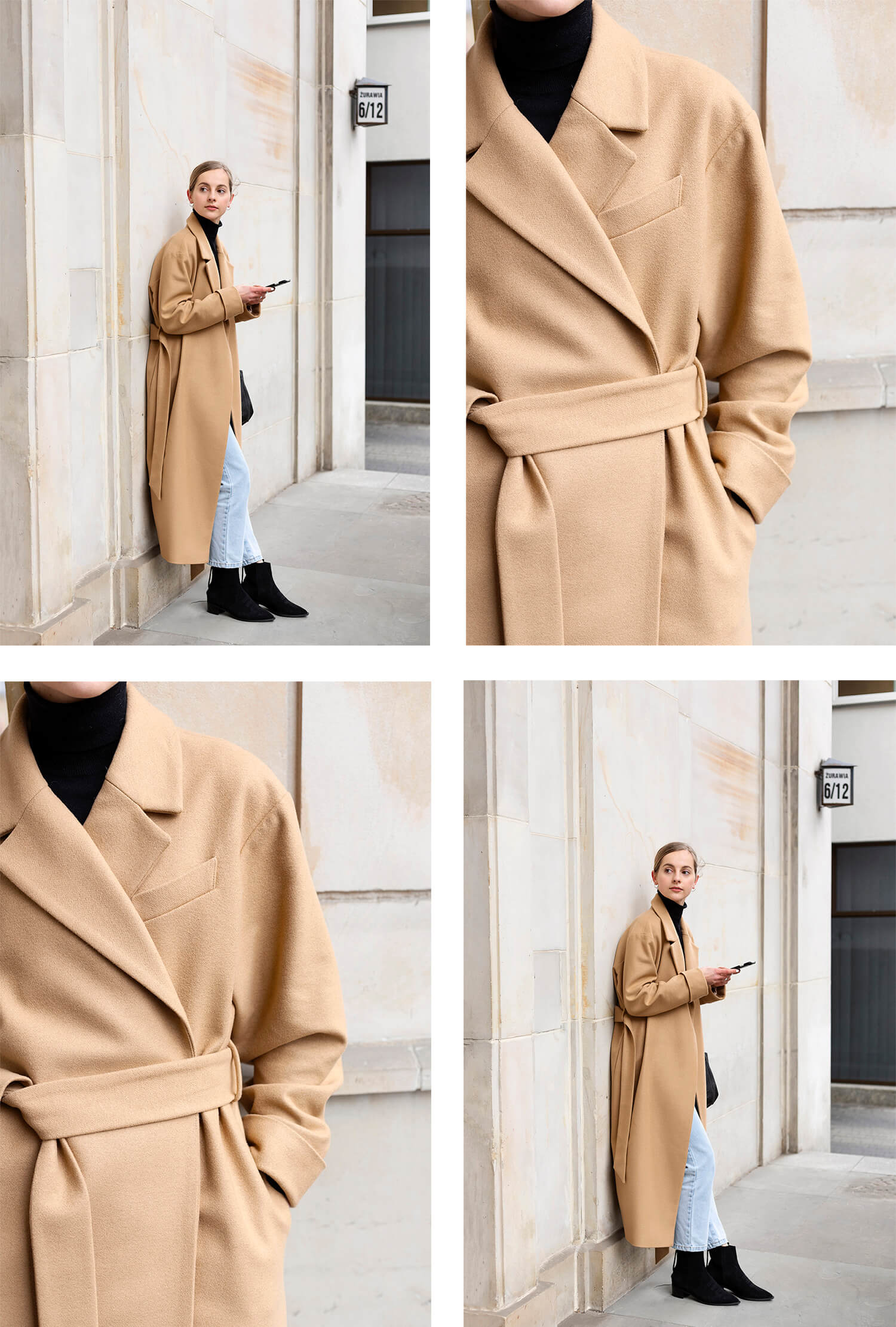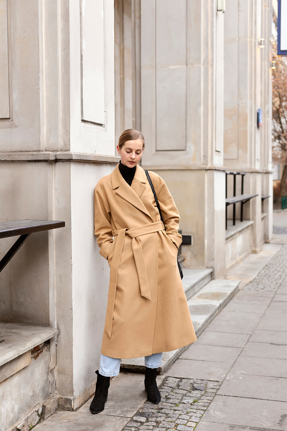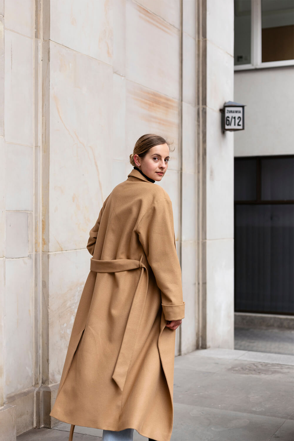 Polska marka nie ma sobie równych jeżeli chodzi o wełnę i płaszcze, dlatego gdy odwiedziłam ich butik na Mysiej w Warszawie i zobaczyłam ten kolor wiedziałam, że nie wyjdę z pustymi rękami. Camelowy klasyk jest cieńszy i delikatniejszy od mojego grubego, wełnianego, szarego modelu, dlatego jest znacznie bardziej dopasowany do sylwetki i smuklejszy. Tak jak poprzednio wybrałam go w większym rozmiarze, aby sięgał wręcz do ziemi.