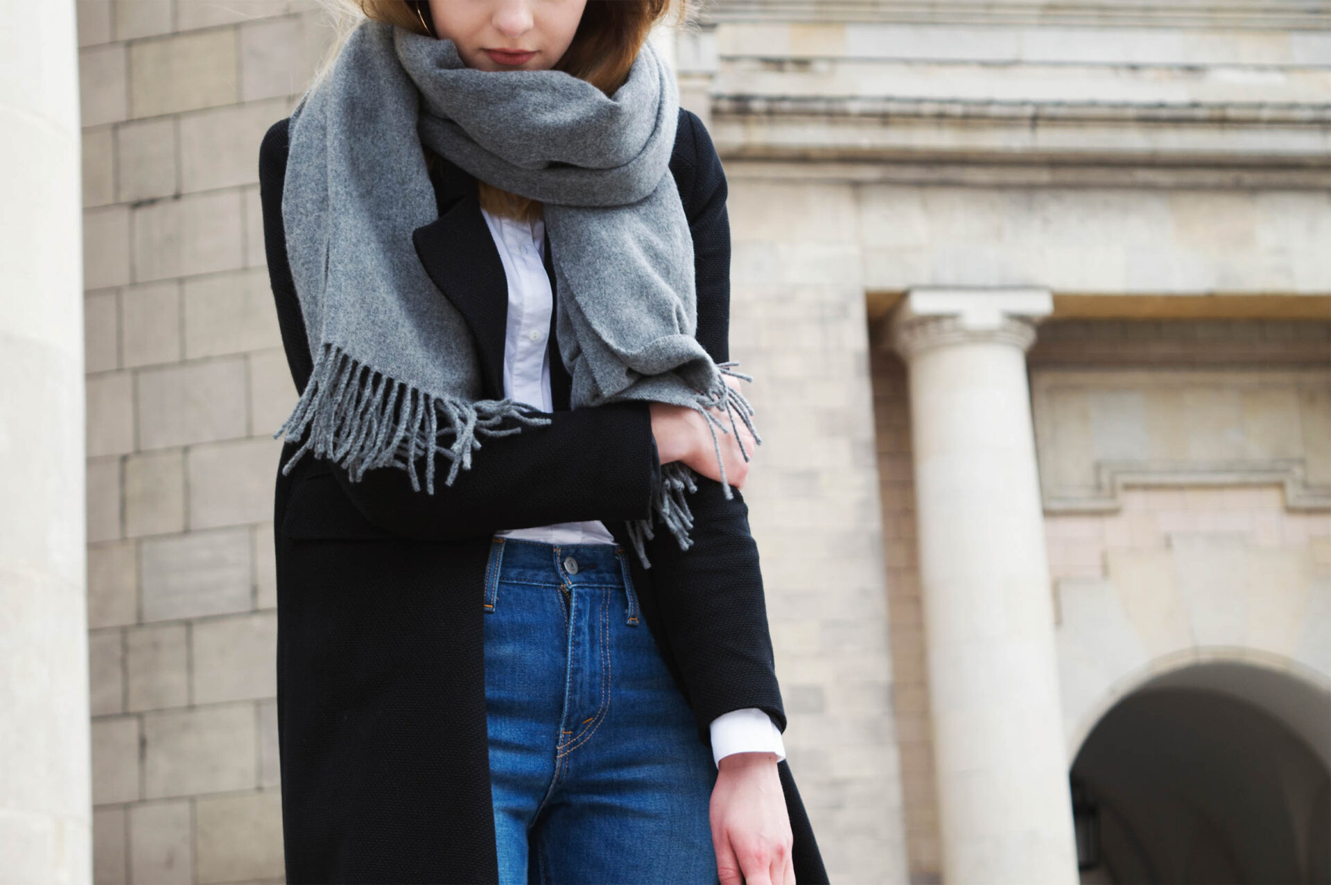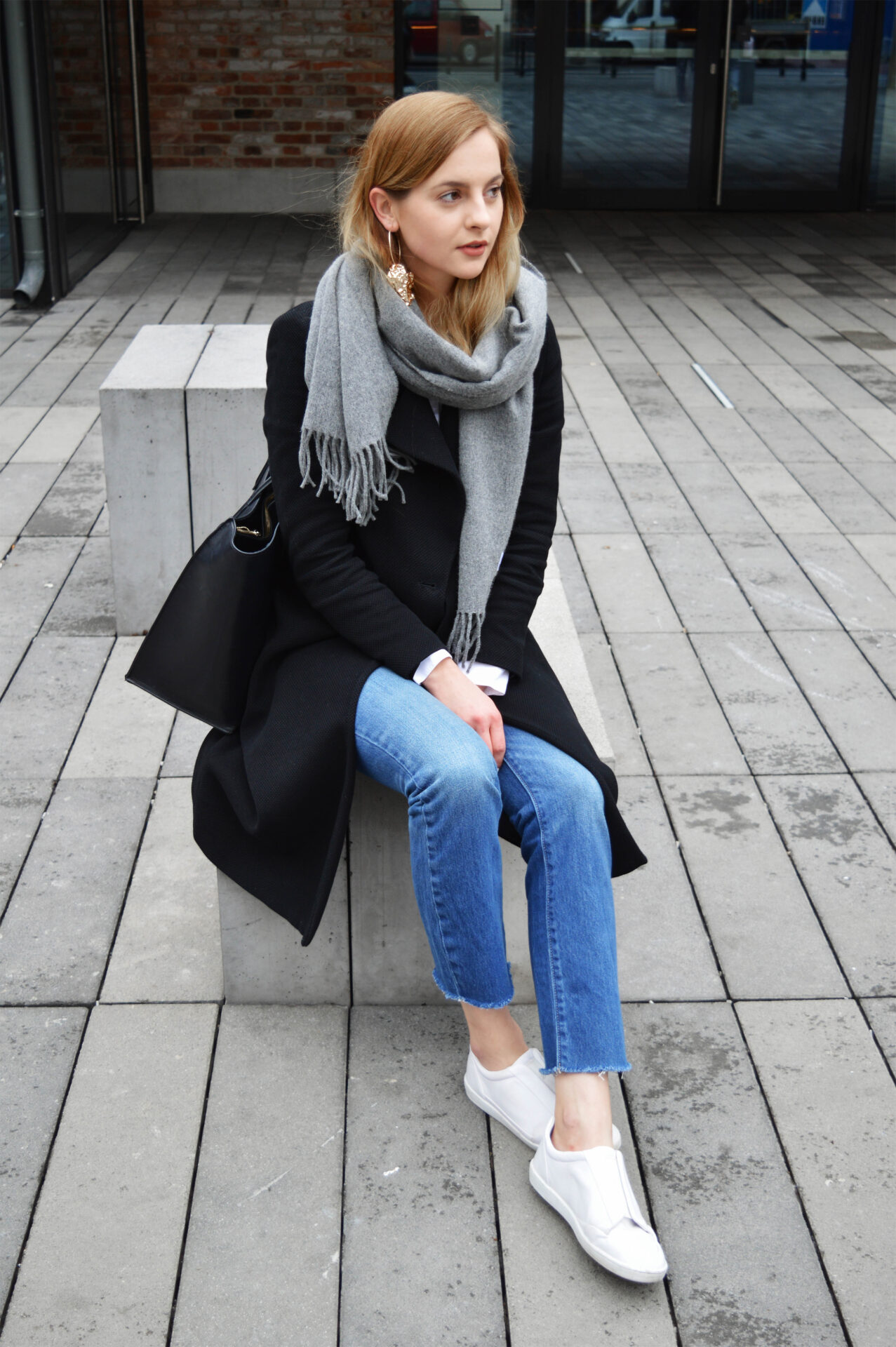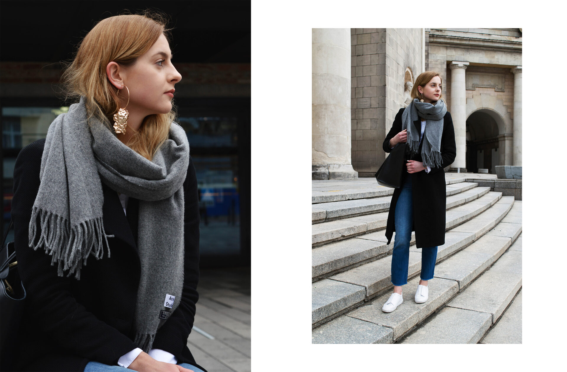Kolczyk Mango | Płaszcz Mango | Szalik Acne Studios | Buty Zara | Jeansy Levis | Torebka Zara | Koszula H&M