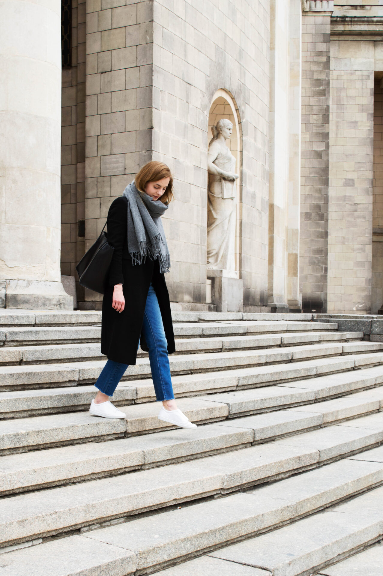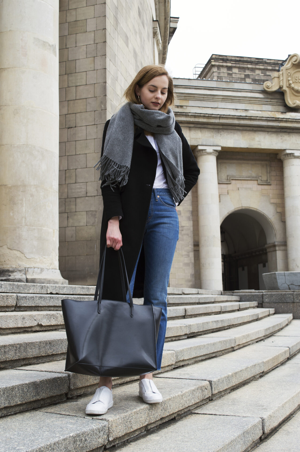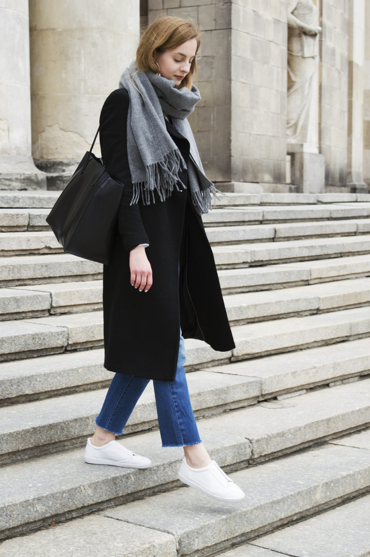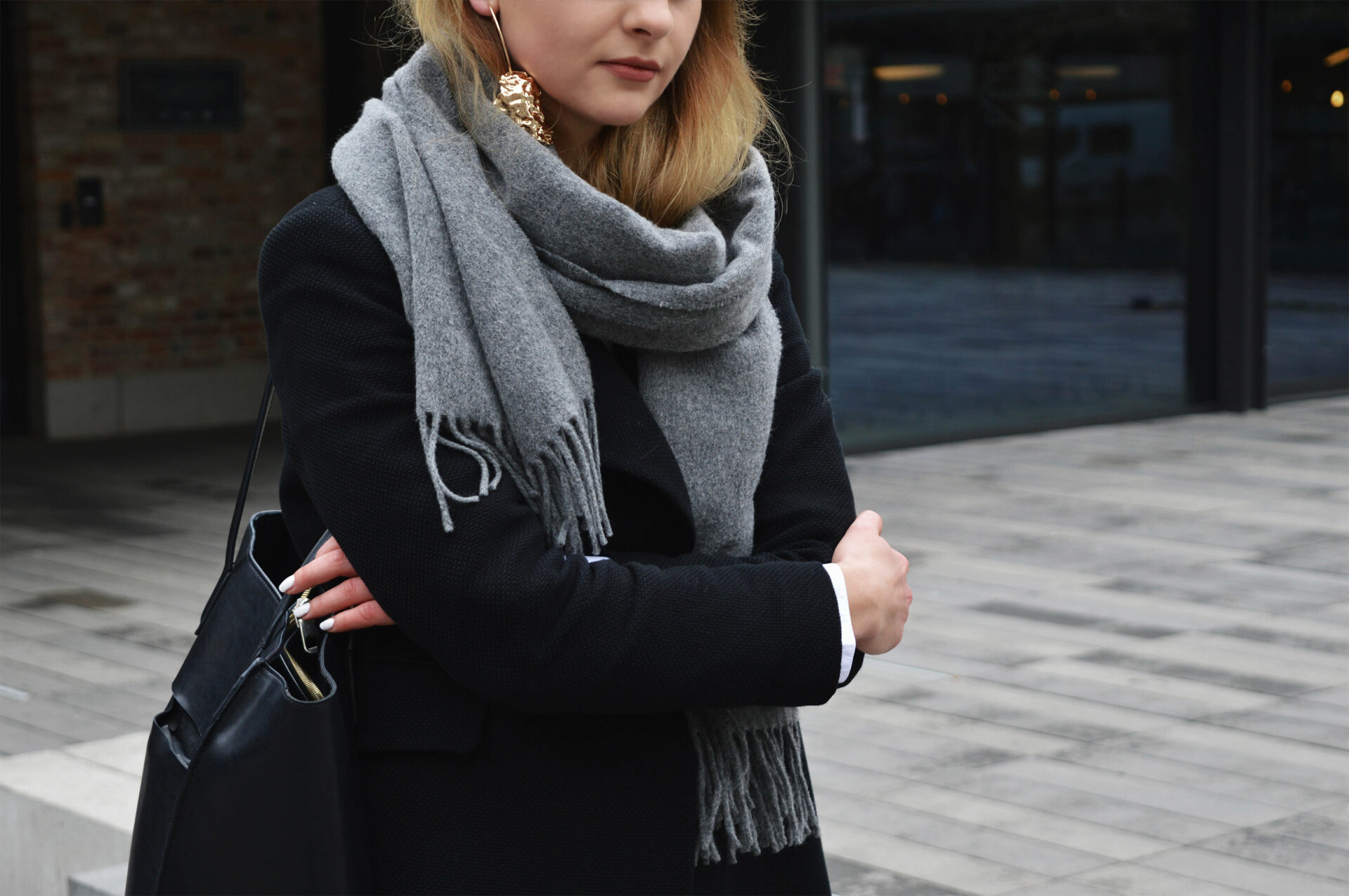 Kolczyk Mango | Płaszcz Mango | Szalik Acne Studios | Buty Zara | Jeansy Levis | Torebka Zara | Koszula H&M