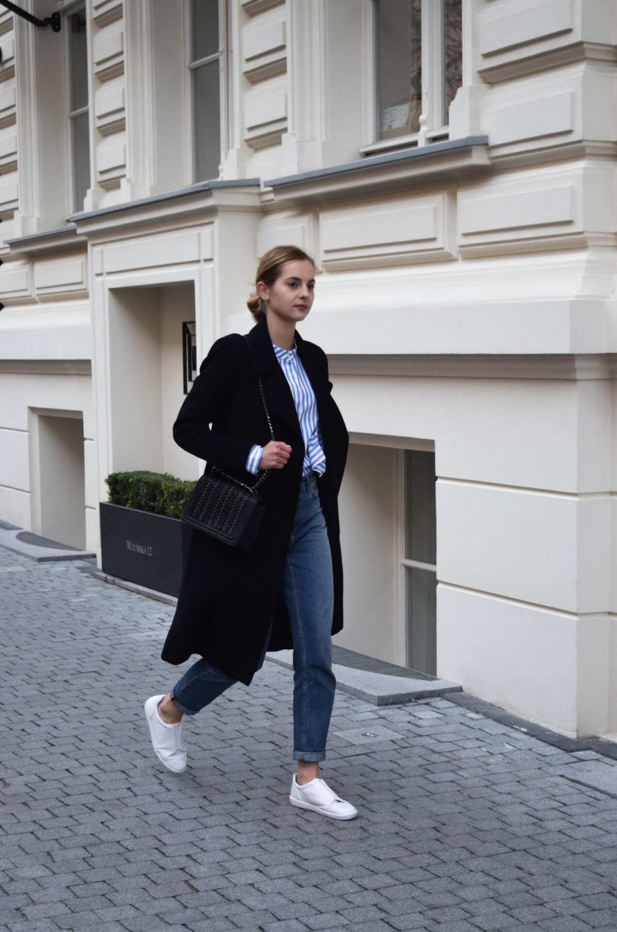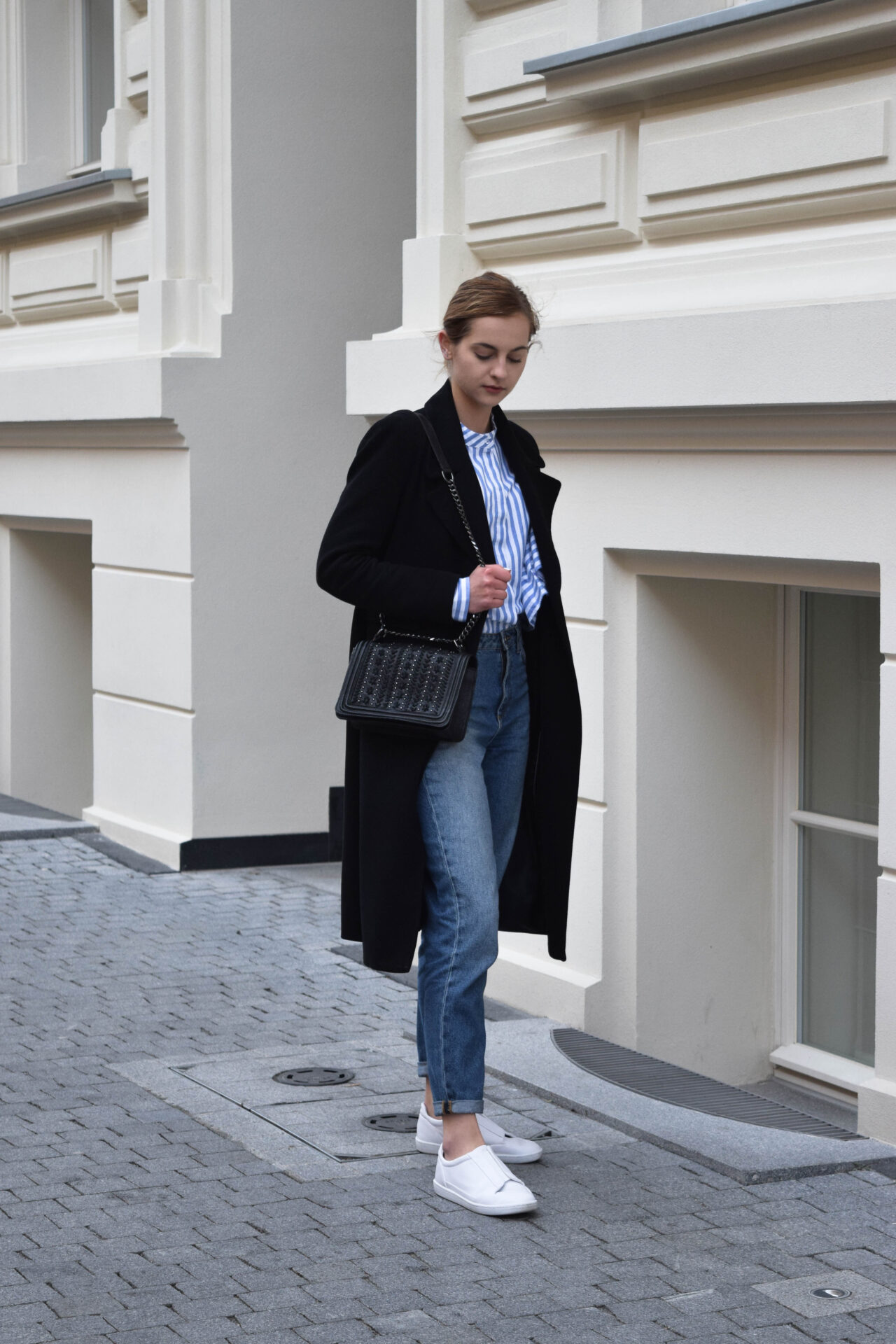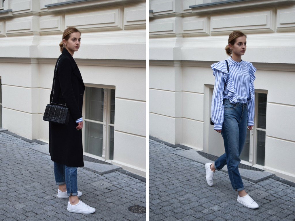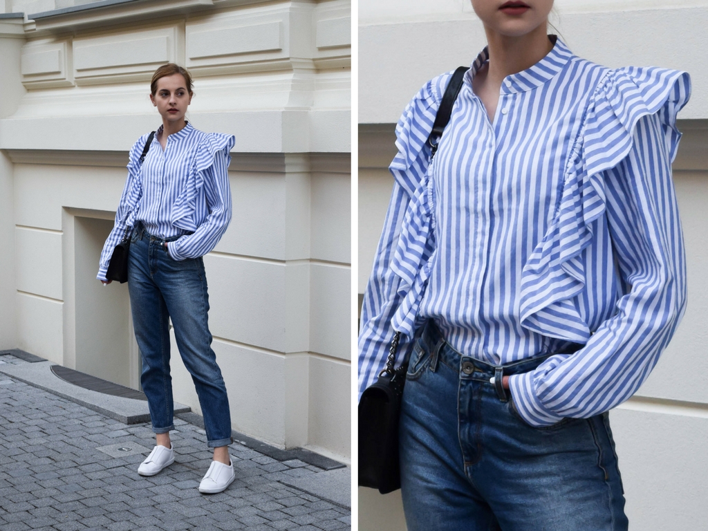 Ruffles, tabs, corsets – I was interested in old court fashion for a long time. I love to watch tv series like Reign (about the Mary I Stuart, queen of Scots) to admire the amazing costumes. I was extremely inspired by the historic trend that we could see on the runways. It was leitmotif of Alexander McQueen spring 2016 collection for instance. In the beginning of the fall we could see ruffles everywhere – on trousers, sweaters, blazers and most importantly on shirts. The one that I chose is from H&M and I fell in love with it’s color and pattern. That kind of piece can be quite daring, so I matched it with classic mom jeans, white sneakers and long coat, to add a more casual style – the one that I like the most 🙂