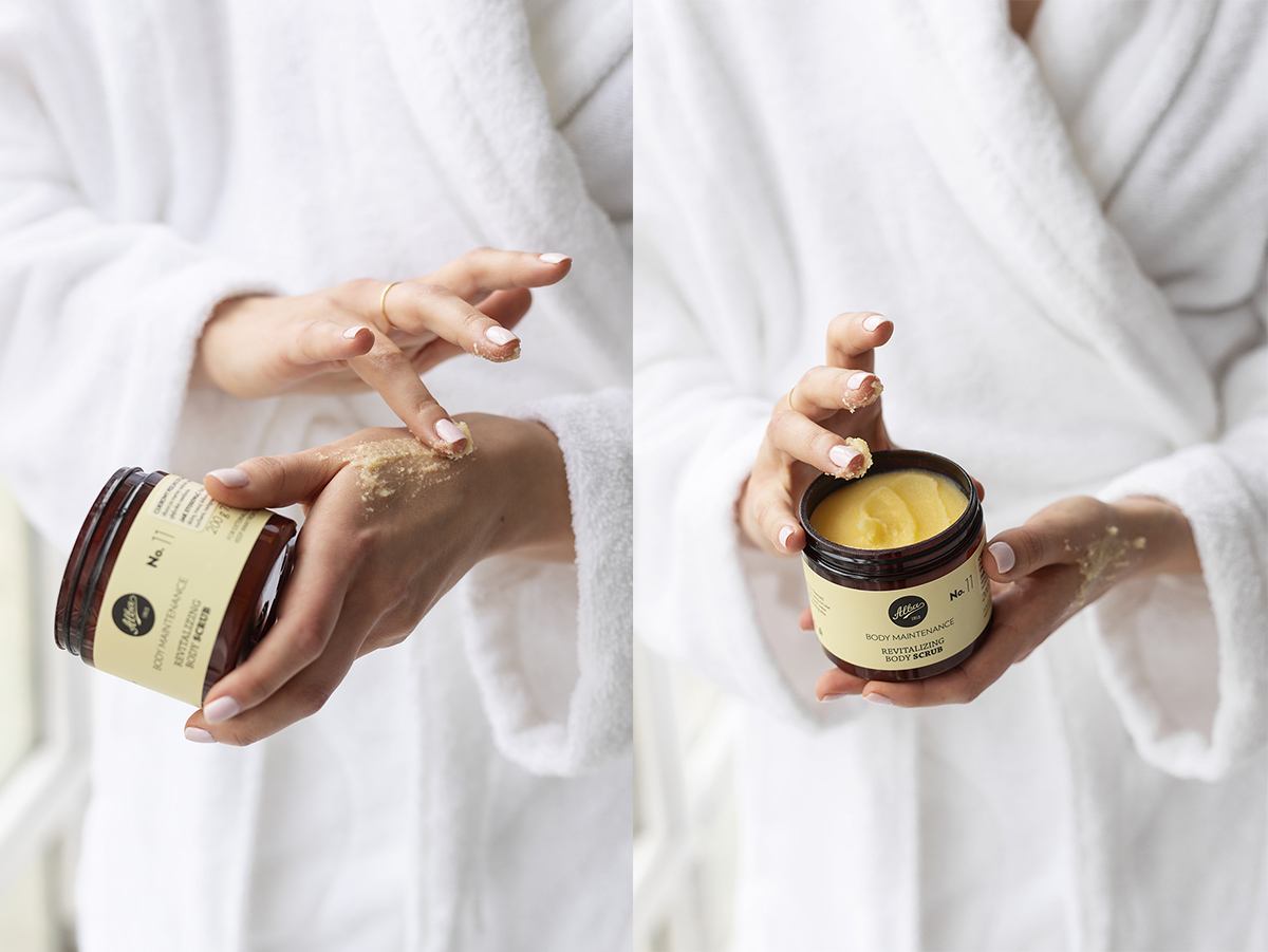 Szczotkuję ciało na sucho, wmasowuję kremy rollerami, robię regularne peelingi – ostatnio używam pomarańczowego od Alby, ale najczęściej własnoręcznie zrobionego kawowego (mieszam w miseczce fusy od porannej kawy, łyżkę miodu i łyżkę oleju kokosowego).