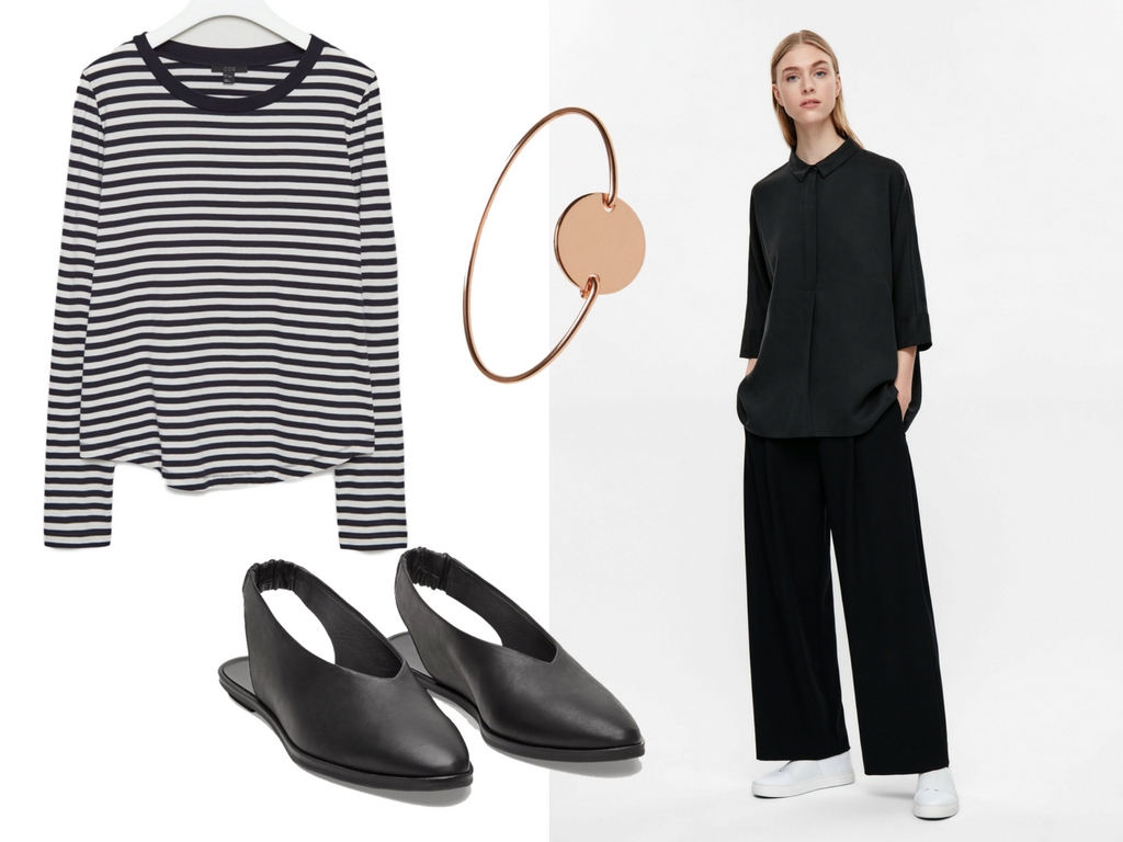 Cos to miejsce, gdzie warto rozejrzeć się za klasycznymi częściami garderoby – spodnie w typie palazzo czy zwykły T-shirt w paski z dobrej jakości bawełny na pewno będą dobrą podstawą. Ponadto znalazłam tutaj kolejną wersję butów w stylu Celine – na płaskiej podeszwie z odkrytą piętą. Poza ubraniami Cos ma również bardzo fajną biżuterię – metalowa bransoletka w odcieniu miedzi to minimalistyczny dodatek, który pasuje prawie do wszystkiego.