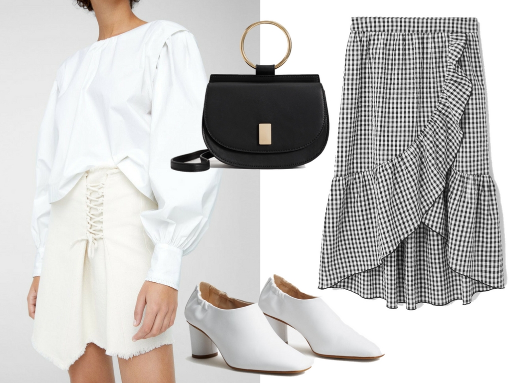 Mango to sieciówka, która w tym roku zachwyciła wszystkich kolekcją wprost wyjętą z pokazów Celine, Stelli McCartney czy J.W Andersona. Na wyprzedaży warto polować na ubrania z linii Committed – styl w klimacie amiszów będzie na topie tego lata. Właśnie z tej kolekcji jest beżowa, lniana, wiązana spódnica. Białe buty miały na sobie niemal wszystkie dziewczyny na fashion weeku, podobnie słynne torebki z uchwytem w formie bransolety – Chloe Nile Bracelet Bag. Ostatnim trendem, który pojawił się w Mango jest krata gingham – mnie najbardziej spodobała się hiszpańska spódnica z falbaną.